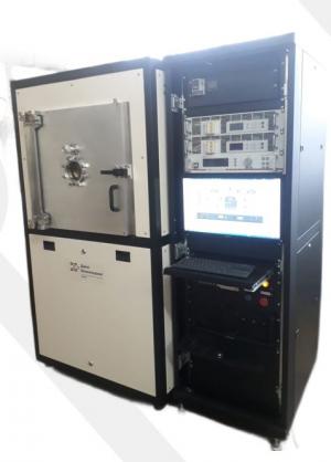 • Конструктивно установка вакуумного напыления выполнена в виде кубической вакуумной камеры, установленной на монтажной раме. Отдельно установлена стандартная 19-ти дюймовая телекоммуникационная стойка с источниками питания, контроллерами и управляющим компьютером, а также чиллер охлаждения